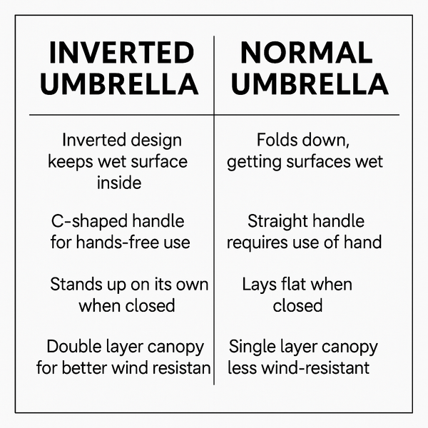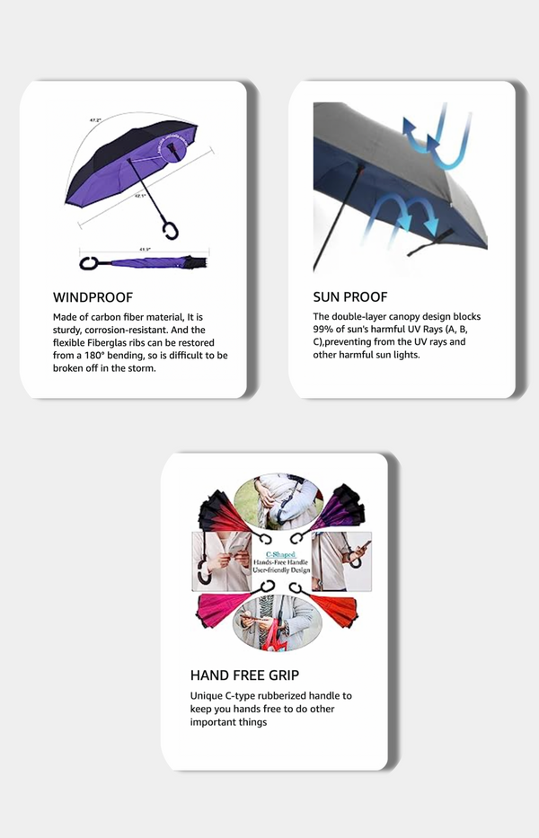 Inside-out Design: Reverse folding umbrella design concept. You can open this inverted umbrella as you open the door or car and not get wet. When closed, the wet side of umbrella becomes inside with the dry side exposed, so there are never wet your clothes, car, floor, bag etc.